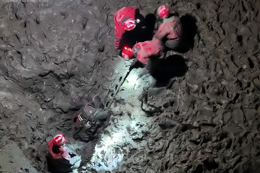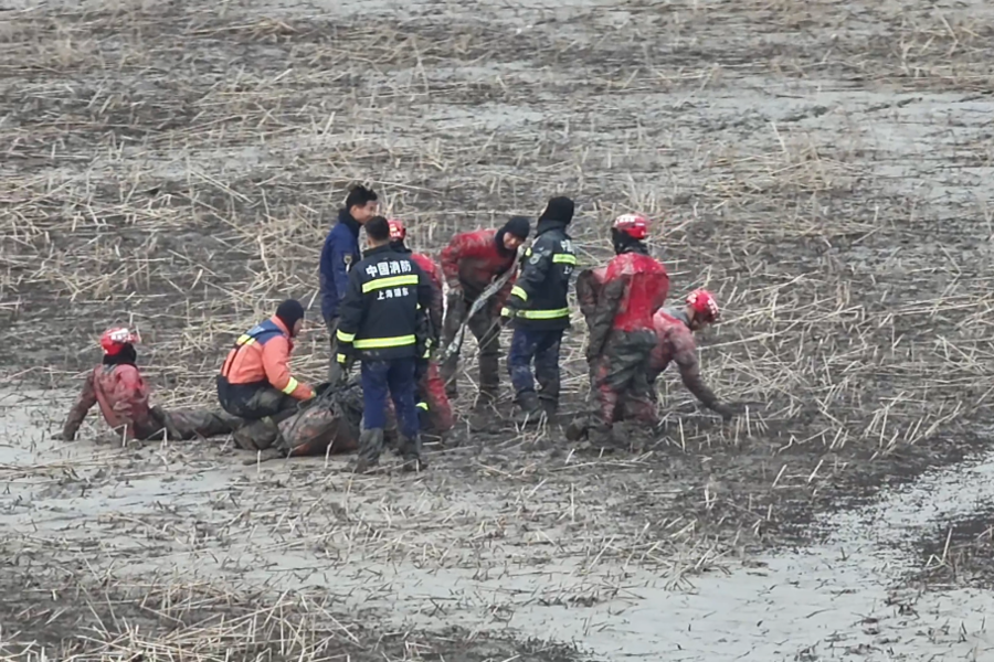 后来,临港新片区管委会应急处还调来了大型无人机。也没能将赵平拖出来。从江苏省启东市紧急调集过来的水陆两栖挖掘机给了大家希望。然而赵平的身体依旧在缓慢下陷。在等待的过程中,救援行动一刻也没有停止。