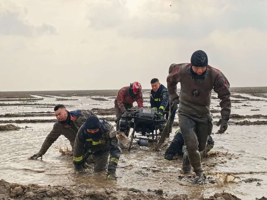 晚上8时40分,消防队员们到达了现场。在热成像无人机的帮助下,他们很快锁定了受困者的位置。在寒潮的狂风中,漆黑的海岸上升起一串明亮的灯光。带着全套水域救援防护装备、桨板绳包等工具。他们找到了赵平和他的同伴。此时,赵平已经被泥土埋压至胸口,而他的同伴虽然已经体力不支,依旧不断尝试刨挖着周围的淤泥。