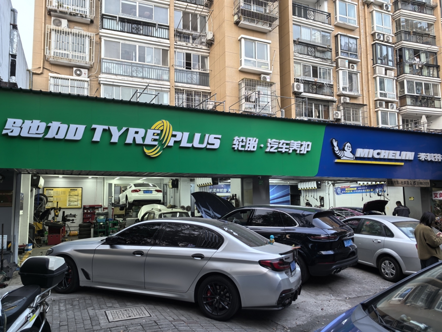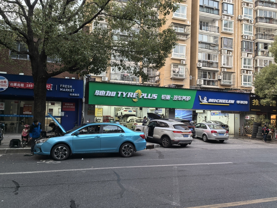近日,记者来到玉兰路81弄,在紧挨小区的杜鹃路北侧,百米内扎堆开了4家汽修店。虽然店面不大,但各家的生意都很红火,前来修车的市民络绎不绝。店内停满了车辆,修车师傅正忙着检修、补胎、冲洗作业。门外人行道和非机动车道上,也停放着多部待修车辆。遇有新客上门,工作人员还主动引导车主将车停靠至路边空位,排队等候。在靠近小区南门的一家“驰加”汽修店外,一名修理工更是直接在非机动车道内,打开一辆蓝色小轿车的引擎盖,检查车况。