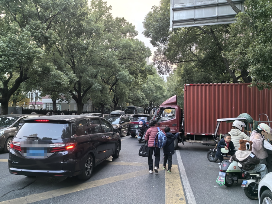 果然,下午4时20分,海桐小学放学后,杜鹃路上乱成“一锅粥”:一边是接送学生的车辆大量涌入,一边是行人、非机动车与汽车争道抢行,场面既混乱又危险。“每天放学来接孩子,都像闯关一样。”市民李女士坦言,近一个月险些和电动自行车发生多次碰撞。