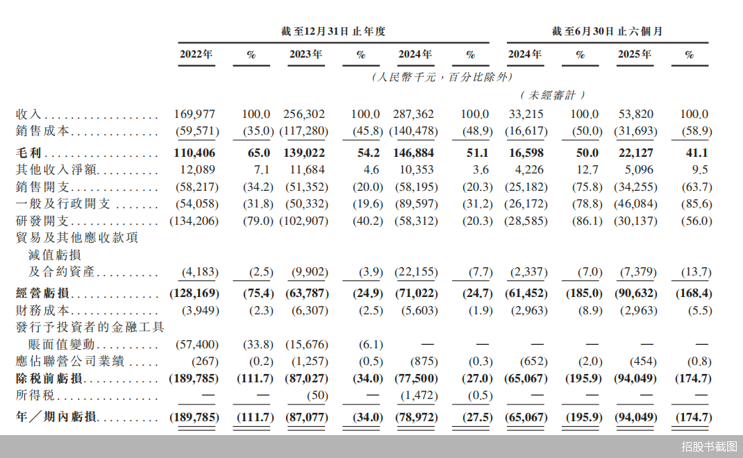 2022—2024年,这家公司营收逐年上涨,分别是1.7亿元、2.56亿元、2.87亿元,经调整净亏损逐年收窄,从1.32亿元减少到6808.1万元,再到2024年的4306.5万元。但到了2025年上半年经调整净亏损转向相反方向,亏损加剧。